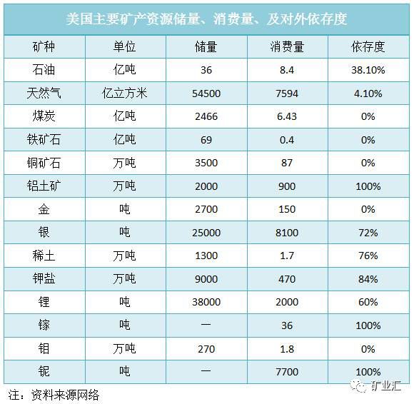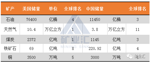 美国作为矿产资源大国,拥有多种矿产资源,且人均矿产资源占有量首屈一指。但本国资源开发力度不大。