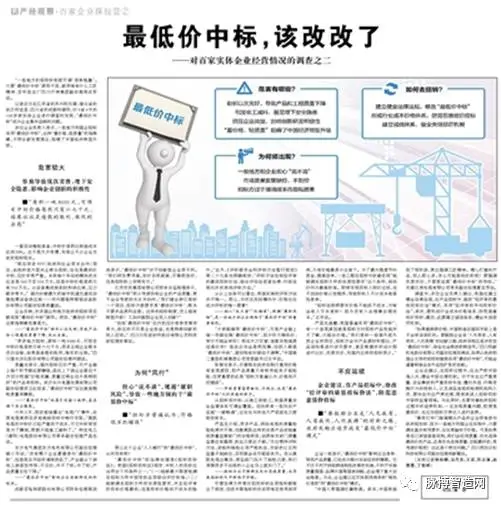 不到一个月的时间里,《人民日报》两次发文诟病“最低价中标”,实为罕见!建设工程质量因“最低价中标”问题频发,使得整个行业怨声载道,也在给业内人士敲响警钟:“最低价中标”原则一天不变,行业就很难有什么工匠精神,更不要说什么中国品牌!”